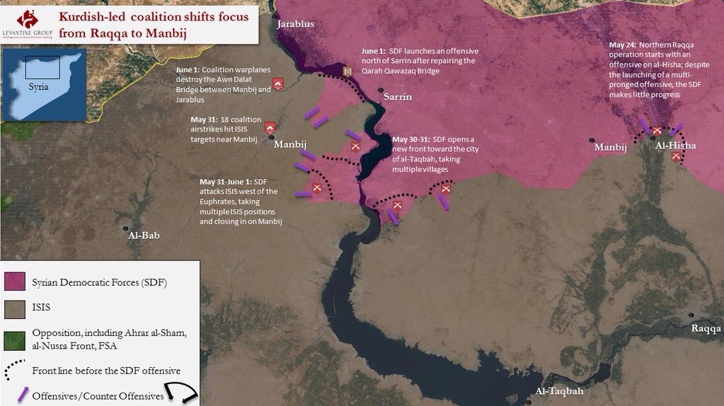 Ο χάρτης μας ενημερώνει ότι στις 31 Μαΐου οι κουρδικές δυνάμεις επιτέθηκαν από το Φράγμα Τισχρίν και κατέλαβαν τις θέσεις της οργάνωσης Ισλαμικό Κράτος, ενώ την ίδια ώρα οι Αμερικανοί βομβάρδιζαν τα περίχωρα της Μανμπίτζ.