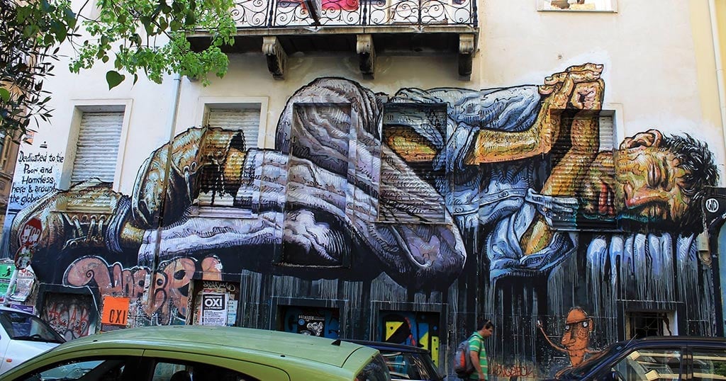 Ένας ρακένδυτος άνδρας έχει ξαπλώσει στο δρόμο και κοιμάται. Έτσι περιγράφει το πρόβλημα των αστέγων ο καλλιτέχνης Wild Drawing, γνωστός ως WD, που δημιούργησε στην οδό Μπενάκη στα Εξάρχεια, ένα τεράστιο γκράφιτι. Το σχέδιο καταλαμβάνει ολόκληρη την πρόσοψη του εγκαταλελειμμένου κτιρίου και φτάνει περίπου τα