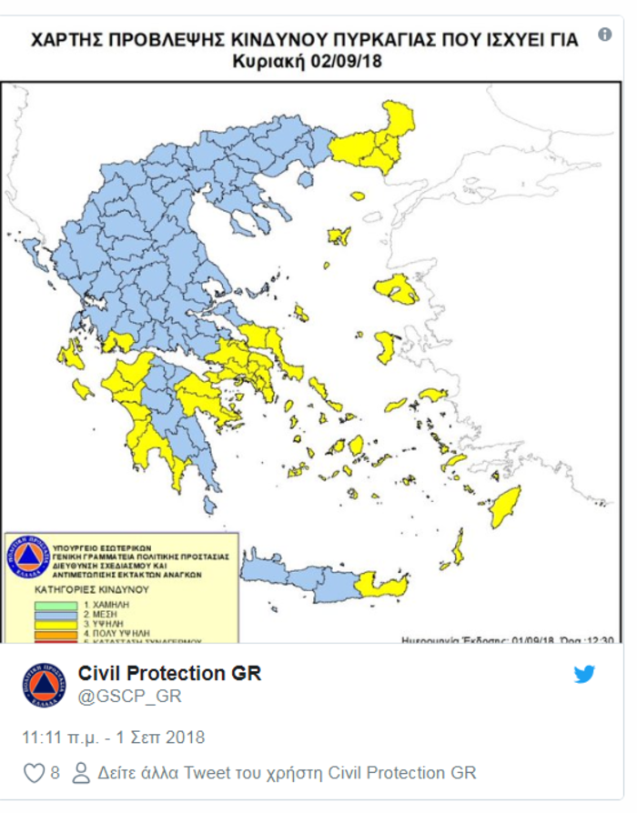 Δείτε τον Χάρτη Πρόβλεψης Κινδύνου Πυρκαγιάς που εξέδωσε σήμερα, η Γενική Γραμματεία Πολιτικής Προστασίας.