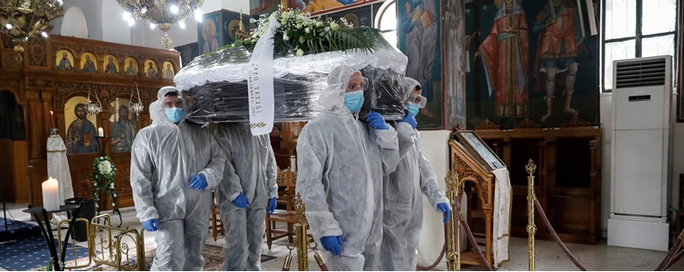 Εντύπωση προκαλεί το αποστειρωμένο περιβάλλον, με το φέρετρο να είναι τυλιγμένο με σελοφάν, με βάση τα σχετικά πρωτόκολλα, ενώ οι τέσσερις άνδρες που το μεταφέρουν είναι αναγκασμένοι -για λόγους προστασίας βέβαια- να φορούν ειδικές στολές, μάσκες και γάντια.