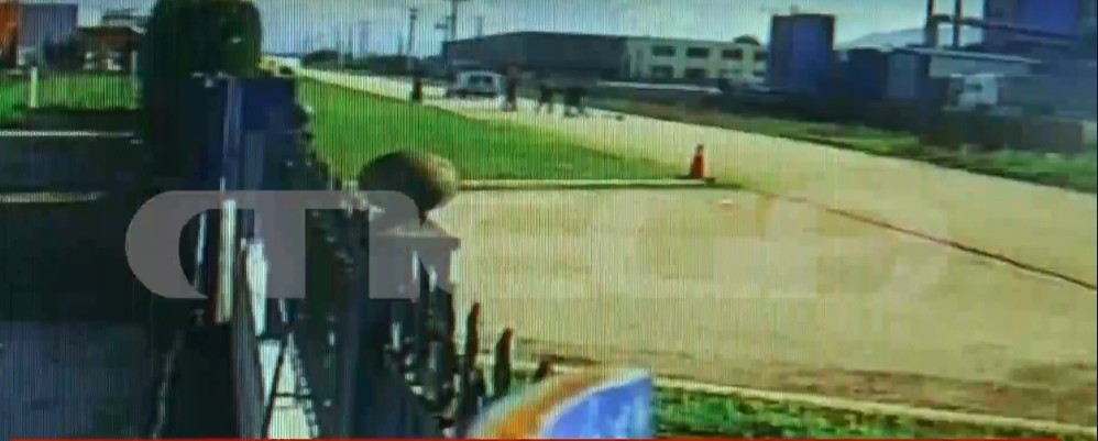 Πριν από το ατύχημα, η ίδια κάμερα ασφαλείας του εργοστασίου καταγράφει την κίνηση. Οι εργάτες δουλεύουν και τα οχήματα περνούν χωρίς κανένας οδηγός να παραπονεθεί.