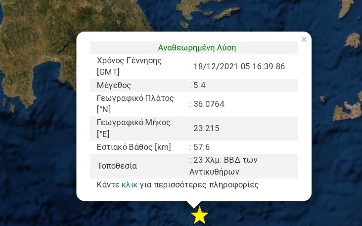 Το επίκεντρο του σεισμού εντοπίζεται 28,1 χλμ Νοτιοανατολικά από τα Κύθηρα και το εστιακό βάθος υπολογίζεται στα 57,6χλμ.