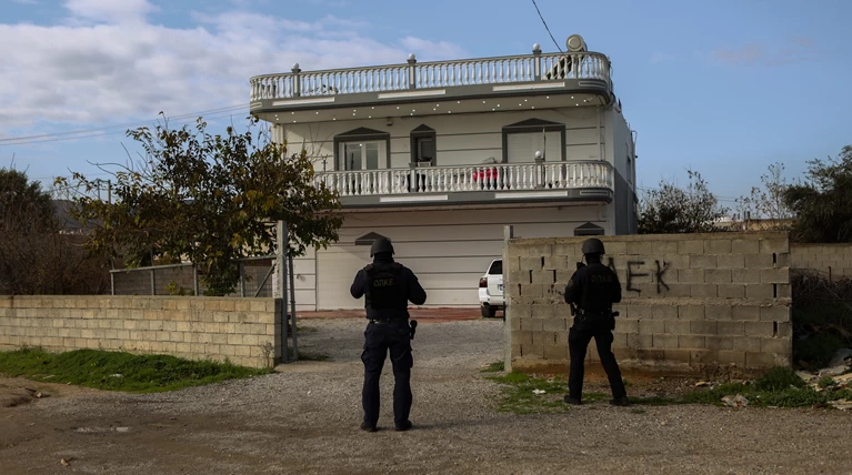 Στην επιχείρηση, η οποία ξεκίνησε στις 9.10 το πρωί, λαμβάνει μέρος και η ΕΚΑΜ, στελέχη της οποίας πραγματοποιούν ελέγχους σε σπίτια στην περιοχή.