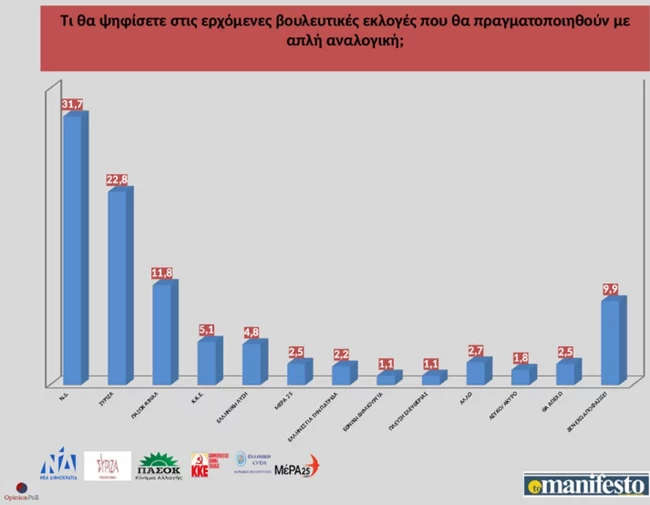 Ν.Δ 31,7%, ΣΥΡΙΖΑ 22,8%, ΠΑΣΟΚ-ΚΙΝΑΛ 11,8%, Κ.Κ.Ε 5,1%, ΕΛΛΗΝΙΚΗ ΛΥΣΗ 4.8%, ΜΕΡΑ 25 2,5%, ΕΛΛΗΝΕΣ ΓΙΑ ΤΗΝ ΠΑΤΡΙΔΑ 2.2% , ΕΘΝΙΚΗ ΔΗΜΙΟΥΡΓΙΑ 1,1% , ΠΛΕΥΣΗ ΕΛΕΥΘΕΡΙΑΣ 1,1%, ΑΛΛΟ ΚΟΜΜΑ 2,7% , ενώ οι Αναποφάσιστοι είναι στο 9,9%.