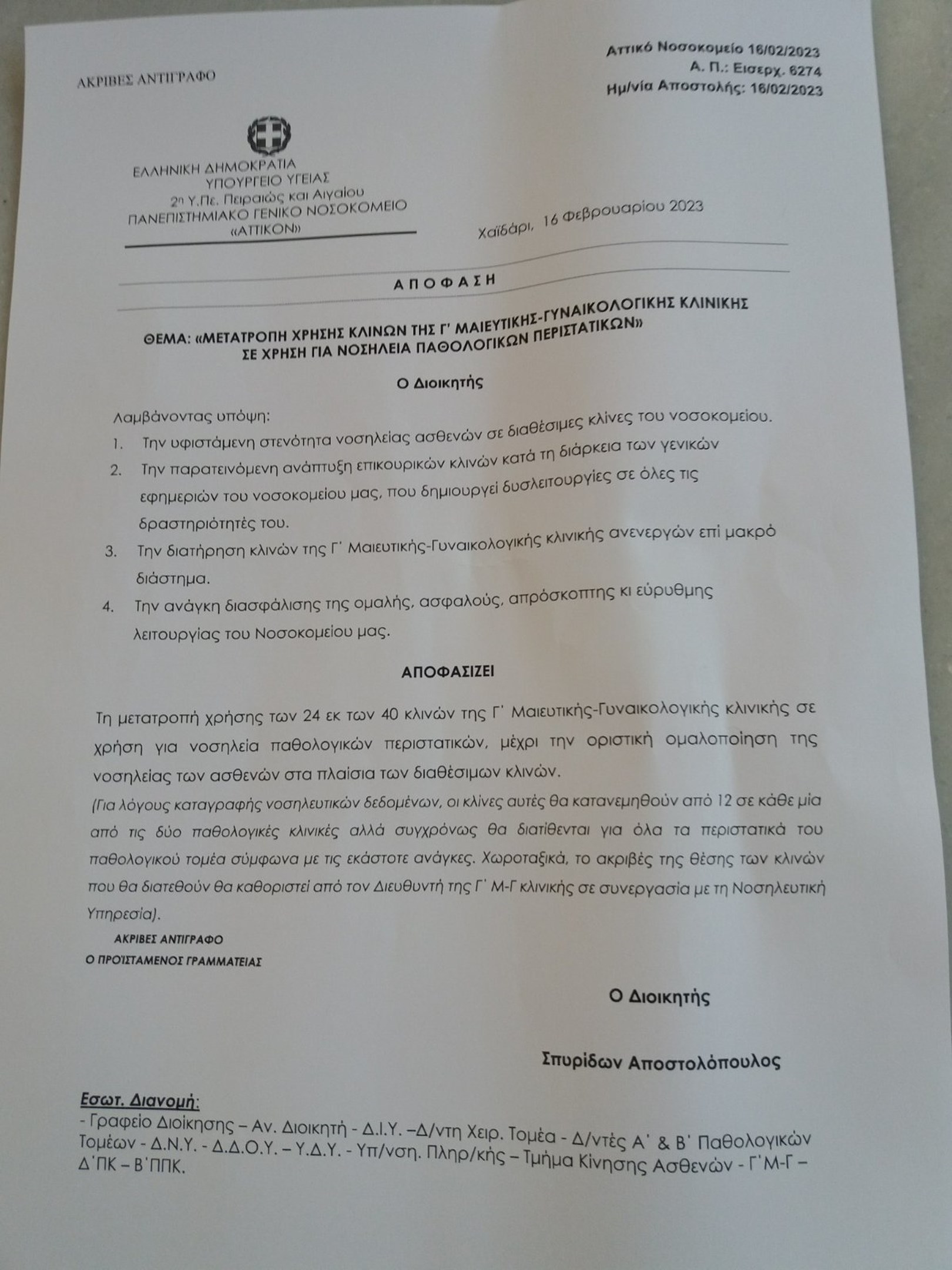 "Ο Διοικητής του Νοσοκομείου ΑΤΤΙΚΟΝ για να κρύψει τα ράντζα του νοσοκομείου εξέδωσε επικίνδυνη απόφαση για διάθεση 24 κλινών της ΜΑΙΕΥΤΙΚΗΣ, ΓΥΝΑΙΚΟΛΟΓΙΚΗΣ ΚΛΙΝΙΚΗΣ που διαθέτει συνολικά 40 κλίνες, σε περιστατικά του παθολογικού τομέα", αναφέρει η ΠΟΕΔΗΝ στην ανακοίνωσή της.