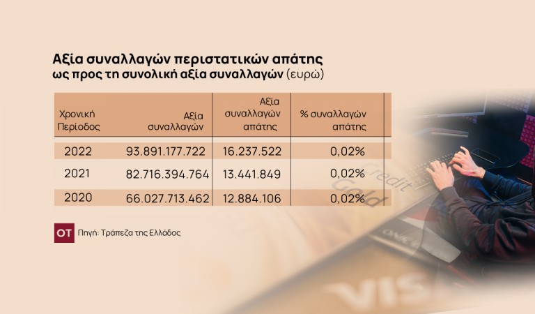 Στα περιστατικά απάτης στις συναλλαγές με κάρτες πληρωμών το 2022 ναι μεν καταγράφηκε μείωση του αριθμού συναλλαγών απάτης κατά 27% σε σχέση με το 2021, μια στις 6.700 συναλλαγές αποτελεί απάτη, παρόλα αυτά τα ποσά που «κάνουν φτερά» είναι περισσότερα.