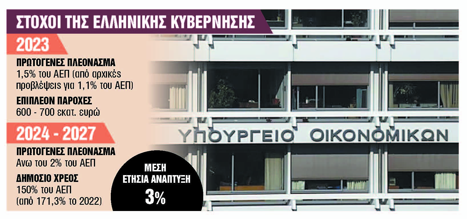 Σύμφωνα με τις εκτιμήσεις, από το 2024 μέχρι το 2027 η Ελλάδα θα έχει πρωτογενές πλεόνασμα πάνω από 2% του ΑΕΠ. Επίσης το χρέος ως ποσοστό του ΑΕΠ αναμένεται να μειωθεί κάτω από το 150% του ΑΕΠ, από 171,3% που έφτασε το 2022.