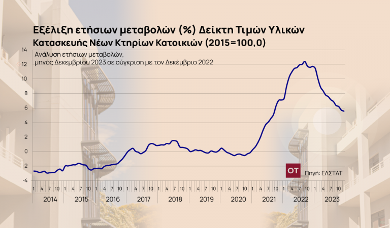 Όπως προκύπτει από τα στοιχεία της ΕΛΣΤΑΤ, ο μέσος δείκτης τιμών υλικών κατασκευής του δωδεκαμήνου Ιανουαρίου 2023 – Δεκεμβρίου 2023, παρουσίασε αύξηση 7,6% σε σύγκριση με τον αντίστοιχο δείκτη του 2022, έναντι αύξησης 11% που σημειώθηκε κατά τη σύγκριση των αντίστοιχων προηγούμενων δωδεκάμηνων.