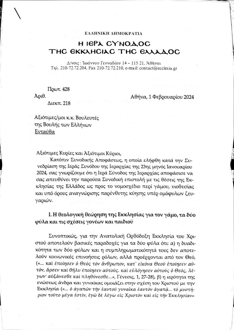 Μεταξύ άλλων, η Ιερά Σύνοδος αναφέρει στην επιστολή της πως «το νομοσχέδιο καταργεί την πατρότητα και τη μητρότητα, ουδετεροποιεί τα φύλα στο πλαίσιο της σχέσης γονέων και παιδιών» και πως «μετατρέπει τους γονείς από πατέρα και μητέρα σε ουδετερόφιλους κηδόμενες».