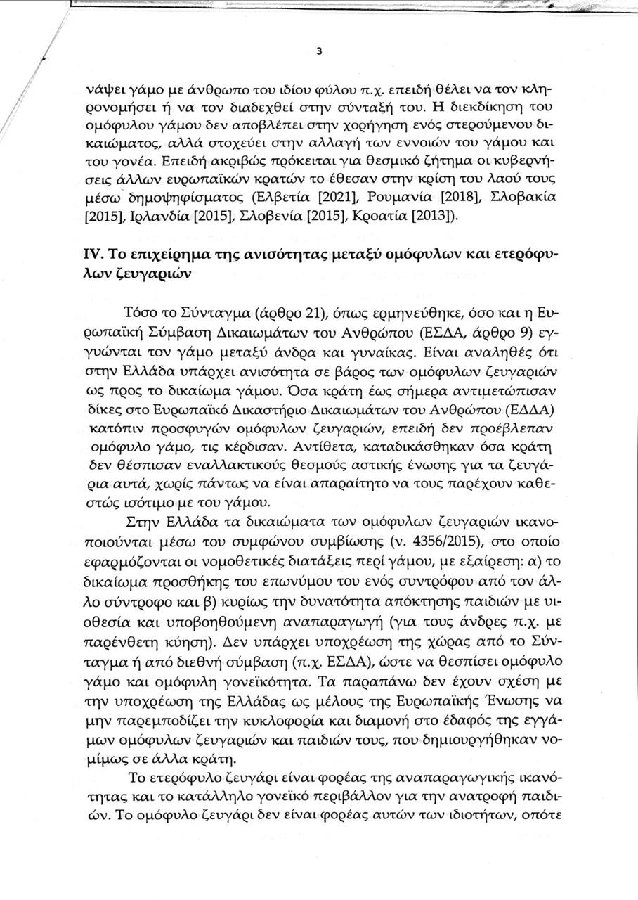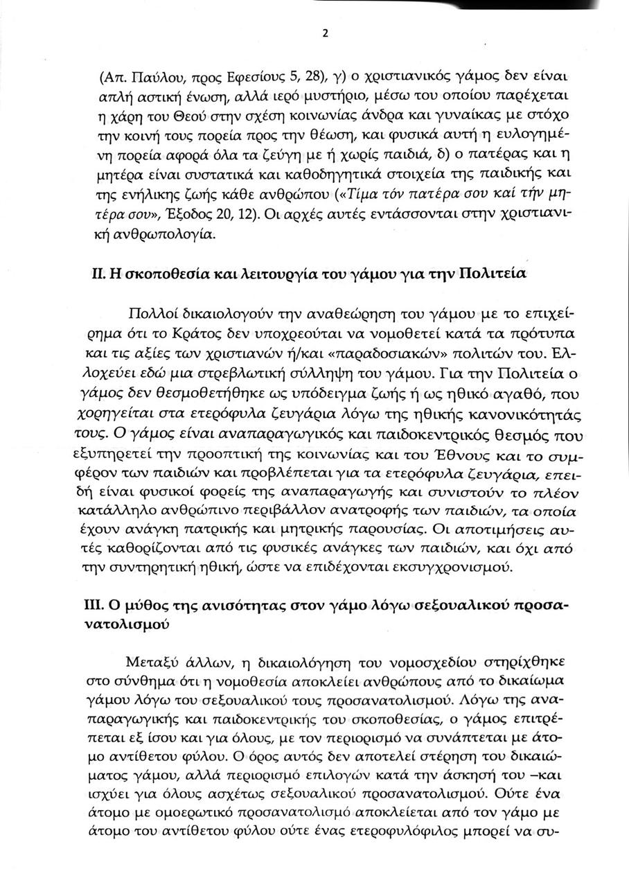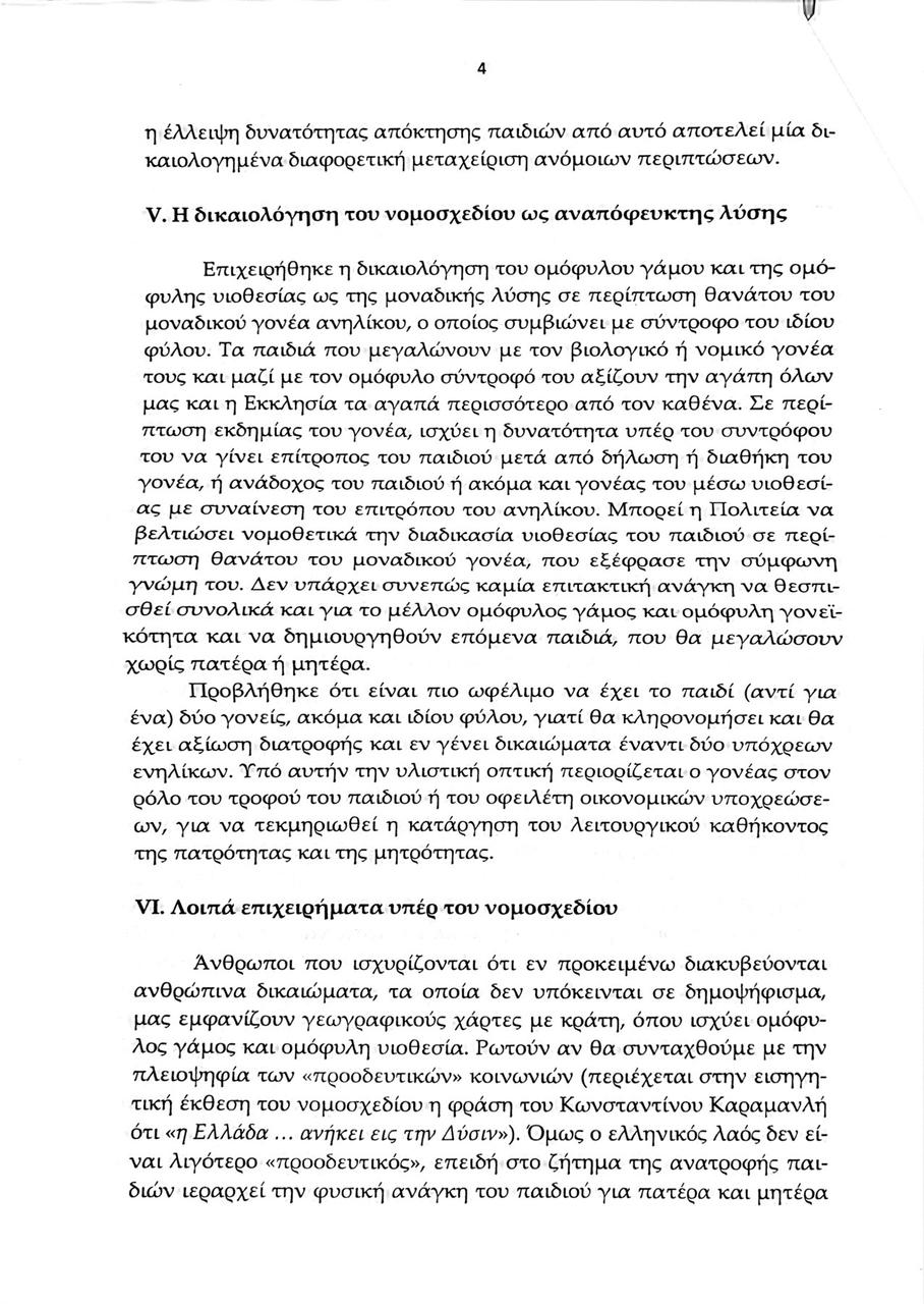 Παράλληλα προσθέτει πως το νομοσχέδιο «τοποθετεί τα δικαιώματα ομοφυλόφιλων ενηλίκων πάνω από τα συμφέροντα των μελλοντικών παιδιών, που θα επιτρέψει να έχουν ως γονείς ομόφυλα ζευγάρια και θα μεγαλώσουν χωρίς πατέρα ή μητέρα, σε ένα περιβάλλον σύγχυσης των ρόλων των δύο φύλων».