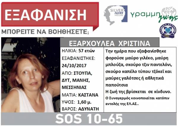 Η 57χρονη Χριστίνα Εξαρχουλέα εξαφανίστηκε από τη Στούπα στις 24 Οκτωβρίου. Τη ημέρα της εξαφάνισης φορούσε μαύρο γιλέκο, μαύρη μπλούζα, σκούρο καπέλο τύπου τζόκεϊ και μαύρες γαλότσες ή αθλητικά παπούτσια. Όποιος γνωρίζει κάτι μπορεί να τηλεφωνήσει στο 1065. eleftheriaonline