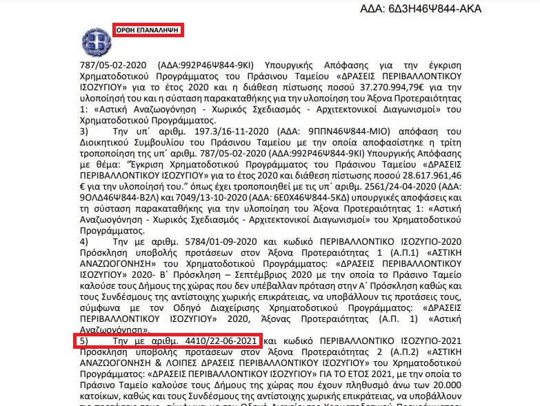 Δύο μέρες μετά την αρχική ανάρτηση στη Δι@υγεια, δημοσιεύθηκε «ορθή επανάληψη» της με αριθμό 222.2.2/2021 απόφασης, στην οποία έγινε προσθήκη στην εισήγηση του διευθυντή στοιχείου με αριθμό 5, όπου αναγράφεται «η με αριθμ. 4410/22-06-2021 και κωδικό Περιβαλλοντικό Ισοζυγιο-2021 Πρόσκληση υποβολής προτάσεων στον Άξονα Προτεραιότητας 2 (Α.Π.2) “Αστική αναζωογόνηση & λοιπές δράσεις περιβαλλοντικού ισοζυγίου” του Χρηματοδοτικού Προγράμματος: Δράσεις περιβαλλοντικού ισοζυγίου για το έτος 2021, με την οποία το Πράσινο Ταμείο καλούσε τους Δήμους της χώρας που έχουν πληθυσμό άνω των 20.000 κατοίκων, καθώς και τους Συνδέσμους της αντίστοιχης χωρικής επικράτειας, να υποβάλουν τις προτάσεις τους, σύμφωνα με τον Οδηγό Διαχείρισης Χρηματοδοτικού Προγράμματος: Δράσεις περιβαλλοντικού ισοζυγίου, για τα έτη 2021-2022, στον Άξονα Προτεραιότητας 2 (Α.Π.2) “Αστική αναζωογόνηση & λοιπές δράσεις περιβαλλοντικού ισοζυγίου”».