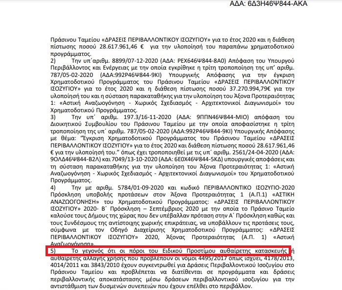 Στην απόφαση αναγραφόταν, μεταξύ άλλων, ότι το Δ.Σ. «συγκλήθηκε με την υπ’ αριθ. πρωτ. 6196/13-09-2021 πρόσκληση του προέδρου του, προκειμένου να συζητήσει και να λάβει απόφαση για το θέμα: Ένταξη έργων στο Χρηματοδοτικό Πρόγραμμα του Πράσινου Ταμείου “Δράσεις περιβαλλοντικού ισοζυγίου”, στον Άξονα Προτεραιότητας 1: “Αστική Αναζωογόνηση”».