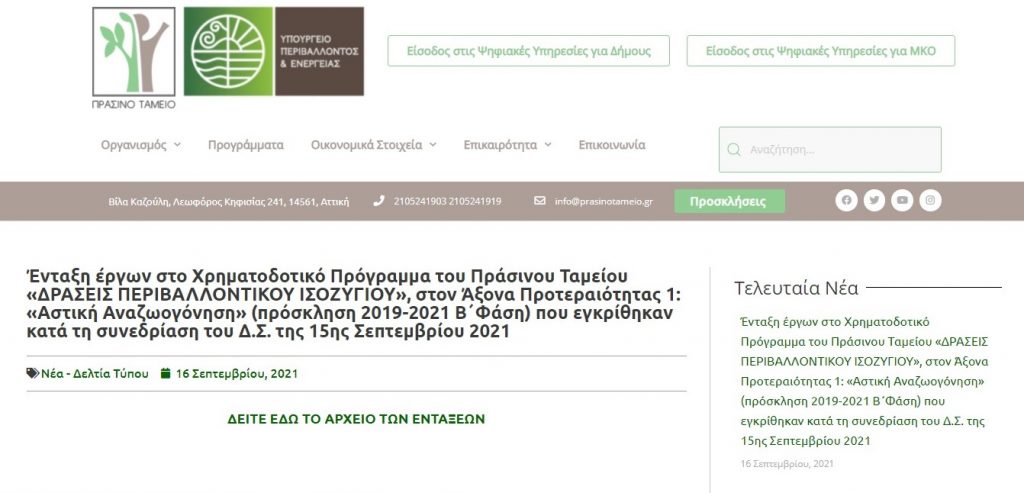 Ο πρώτος, «Πρόσκληση 2020 – Β΄ Φάση», περιλαμβάνει εντάξεις έργων για τις οποίες ελήφθη απόφαση στη συνεδρίαση της Τετάρτης του Δ.Σ. του Πράσινου Ταμείου, οι οποίες, όπως έχουμε αναφέρει, έγιναν έπειτα από αποφάσεις των Οικονομικών Επιτροπών των Δήμων Γορτυνίας, Δωρίδος, Κιμώλου, Οινουσσών, Θήρας, Καισαριανής, Παξών, Σκύρου (2 προτάσεις) για υποβολή πρότασης κάθε Δήμου εξ αυτών στο χρηματοδοτικό πρόγραμμα «Δράσεις περιβαλλοντικού ισοζυγίου» 2020 στον Άξονα Προτεραιότητας 1 (Α.Π.1) «Αστική αναζωογόνηση» του Πράσινου Ταμείου!