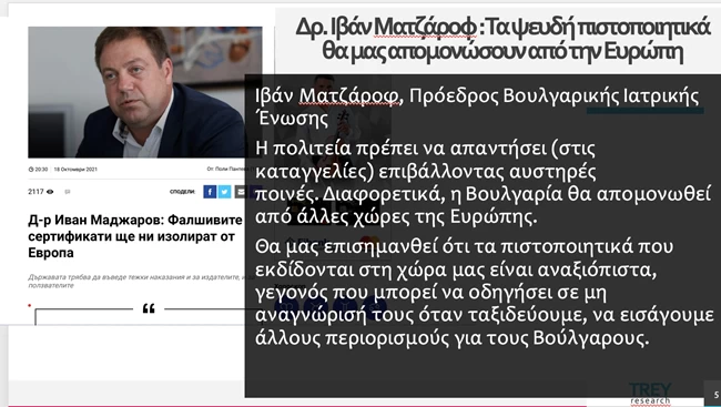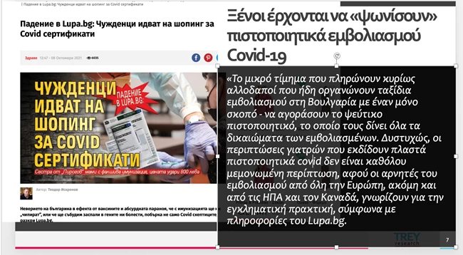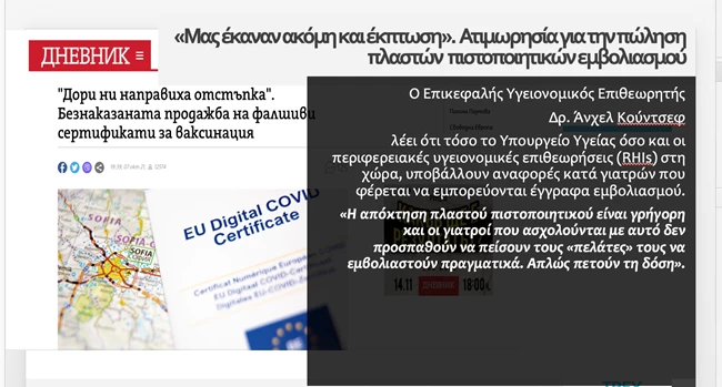 Σύμφωνα με την μαρτυρία "μεσάζοντα" που προβλήθηκε στην εκπομπή "Από τις έξι", από την έρευνα της δημοσιογράφου Νίας Αβδελλή, με μόλις 300 ευρώ και μια ολιγόωρη επίσκεψη στη Σόφια, μπορεί κάποιος να προμηθευτεί Ευρωπαϊκό Πιστοποιητικό Εμβολιασμού.