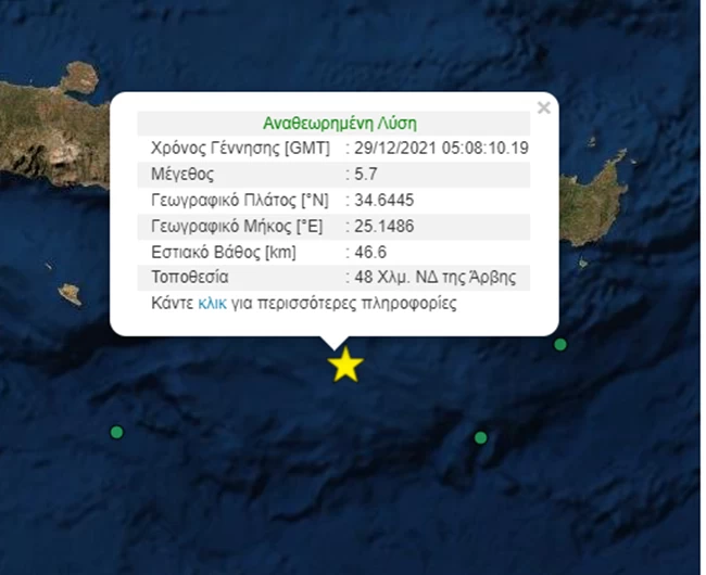 Σύμφωνα με το Γεωδυναμικό Ινστιτούτο, ο σεισμός ήταν 5,7 Ρίχτερ με εστιακό βάθος 46,6 χιλιομέτρων και σημειώθηκε νότια της Κρήτης.