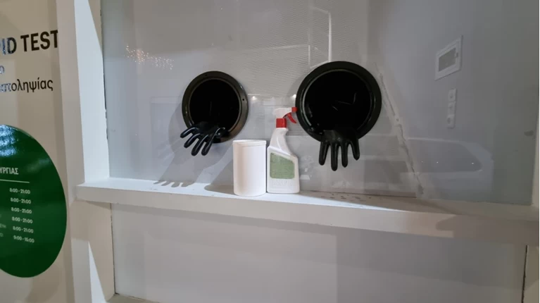 Όπως φαίνεται και στις φωτογραφίες του trikalavoice.gr, στήθηκε ειδική γωνιά στο φαρμακείο, με τον υπάλληλο να εισέρχεται στο χώρο και πίσω από ένα τζαμάκι με τον ίδιο μόνο να έχει οπτική επαφή και φορώντας τα ειδικά γάντια τα οποία παραμένουν σταθερά στο σημείο, κάνει εύκολα, γρήγορα και με ασφάλεια το τεστ.