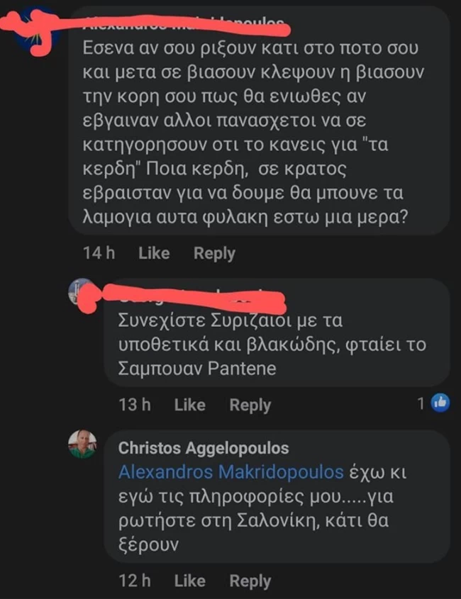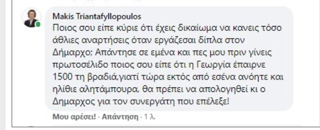 Στον σύμβουλο του δημάρχου Αργους απάντησε ο Μάκης Τριανταφυλλόπουλος, γράφοντάς του: "Ποιος σου είπε κύριε ότι έχεις δικαίωμα να κάνεις τόσο άθλιες αναρτήσεις όταν εργάζεσαι δίπλα στον δήμαρχο; Απάντησε σε εμένα και πες μου πριν γίνεις πρωτοσέλιδο, ποιος σου είπε ότι η Γεωργία έπαιρνε 1.500 τη βραδιά, γιατί τώρα εκτός από εσένα ανόητε και ηλίθιε, θα πρέπει να απολογηθεί και ο δήμαρχος για τον συνεργάτη που επέλεξε".