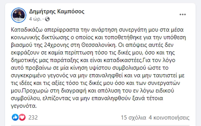 "Καταδικάζω απερίφραστα την ανάρτηση συνεργάτη μου στα μέσα κοινωνικής δικτύωσης ο οποίος και τοποθετήθηκε για την υπόθεση βιασμού της 24χρονης στη Θεσσαλονίκη. Οι απόψεις αυτές δεν εκφράζουν σε καμία περίπτωση τόσο τις δικές μου, όσο και της δημοτικής μας παράταξης και είναι καταδικαστέες.Για τον λόγο αυτό προβαίνω σε μία κίνηση υψίστου συμβολισμού ώστε το συγκεκριμένο γεγονός να μην επαναληφθεί και να μην ταυτιστεί με τις ιδέες και τις αξίες τόσο τις δικές μου όσο και των συνεργατών μου. Προχωρώ στη διαγραφή και απόλυση του εν λόγω ειδικού συμβούλου, ελπίζοντας να μην επαναληφθούν ξανά τέτοια γεγονότα", έγραψε στον λογαριασμό του στο facebook μετά το περιστατικό, ο δήμαρχος Αργους-Μυκηνών Δημήτρης Καμπόσος.