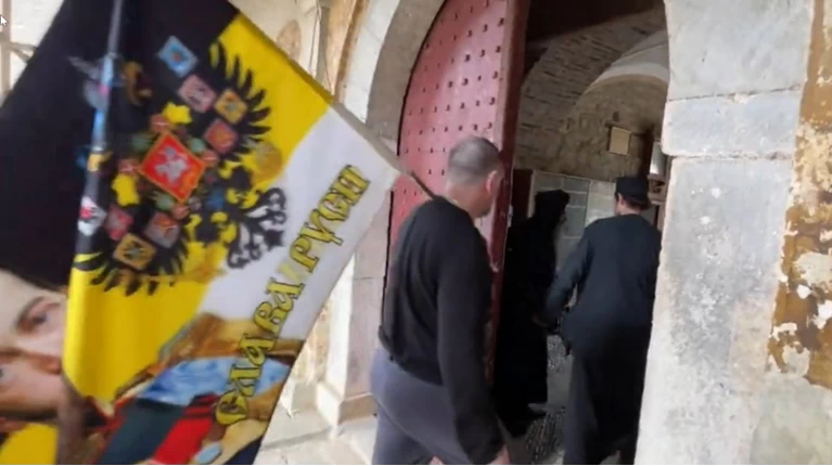 Υπενθυμίζουμε πως "ιεραρχία" στην "εκκλησία ΓΟΧ Ελλάδος" "συγκροτήθηκε" την δεκαετία του 1960 με την βοήθεια και παροχή επίπλαστης "εκκλησιαστικής" νομιμοφάνειας από κάποιους φιλοτσαρικούς Ρώσους της Αμερικής. Σε βίντεο που προσφάτως κυκλοφόρησε στο διαδίκτυο βλέπουμε την είσοδο στο κατειλημμένο κτήριο της Μονής ομάδας (με επικεφαλής κάποιον ιερέα) Ρώσων υπερεθνικιστών φέροντες σημαία της πάλαι ποτέ Ρωσικής Αυτοκρατορίας, μαζί με τον αντίστοιχο θυρεό του εθνοσήμου και την εικόνα του τσάρου. Η είσοδος αυτή δεν ήταν τυχαία, ούτε χωρίς να το αντιληφθούν οι καταληψίες. Όπως φαίνεται στο βίντεο, τους σταμάτησαν για έλεγχο στην πόρτα, μετά ήρθε ένας ρωσόφωνος καταληψίας για να δοθούν "αμοιβαίες εξηγήσεις", και αφού πέρασε κάποια ώρα για να ενημερώσουν τον αρχηγό της κατάληψης, τους επετράπη η είσοδος εντός του κατειλημμένου κτηρίου συνοδεία του ρωσόφωνου καταληψία ρασοφόρου".