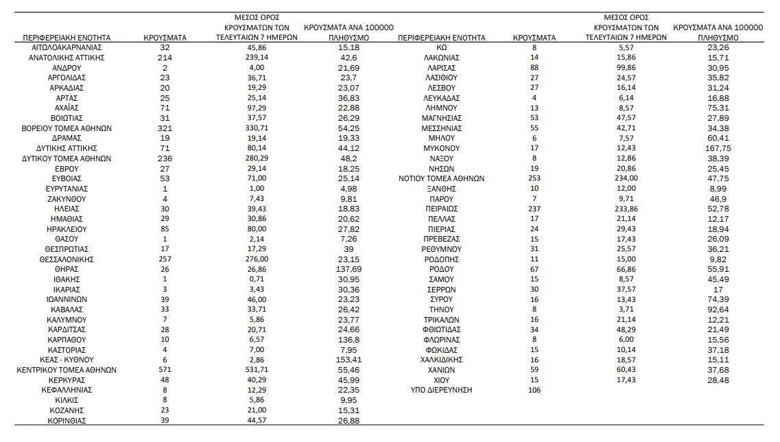 Η κατανομή των 3.772 νέων εγχώριων κρουσμάτων ανά Περιφερειακή Ενότητα παρουσιάζεται στον κατωτέρω πίνακα.