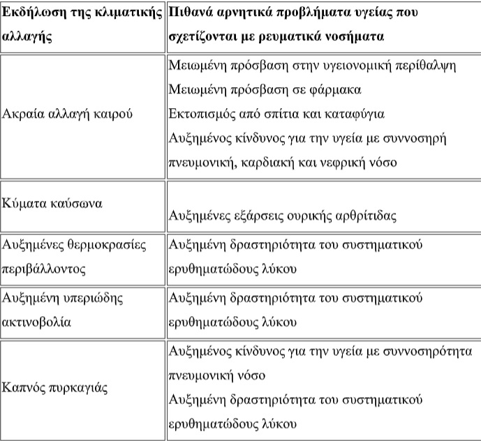 Εκδηλώσεις κλιματικής αλλαγής και πιθανές δυσμενείς επιπτώσεις στην υγεία που σχετίζονται με ρευματικά νοσήματα: