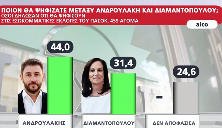 Αντίστοιχη είναι η «νίκη» Ανδρουλάκη και σε μία πιθανή αναμέτρηση με την Άννα Διαμαντοπούλου με τα ποσοστά να είναι 44% έναντι 31,4% ενώ νικητής αναδεικνύεται ο Νίκος Ανδρουλάκης και στο σενάριο αναμέτρησης στον δεύτερο γύρο με τον Παύλο Γερουλάνο, με τα ποσοστά τους να είναι 46,8% έναντι 27,7%, αντίστοιχα.