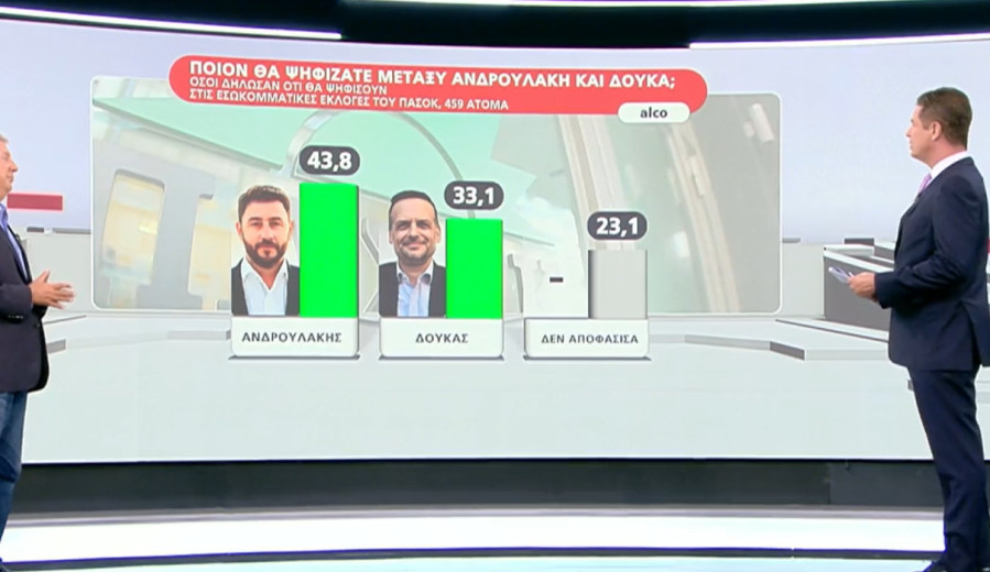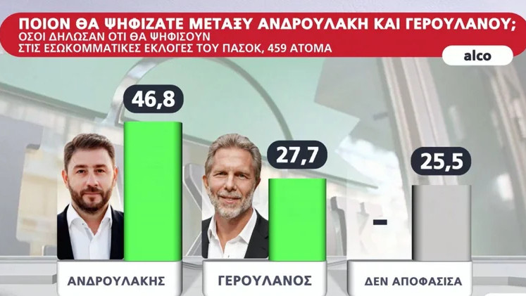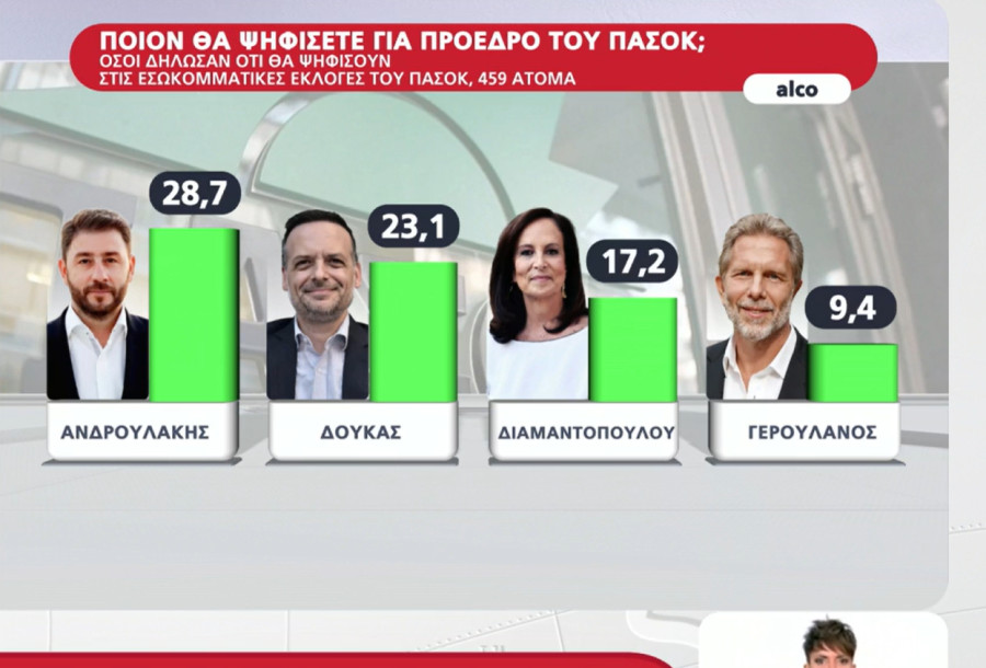 Οι ψηφοφόροι του ΠΑΣΟΚ επιλέγουν τον Νίκο Ανδρουλάκη για την ηγεσία του κόμματος με ποσοστό 28,7%, ενώ ακολουθεί ο Χάρης Δούκας με 23,1%, η Άννα Διαμαντοπούλου με 17,2% και ο Παύλος Γερουλάνος με 9,4%. Ακολουθούν οι Μιχάλης Κατρίνης με 4,4% και Ν. Γιαννακοπούλου με 3,3%. Αναποφάσιστο δηλώνει ποσοστό της τάξης του 13,7%.