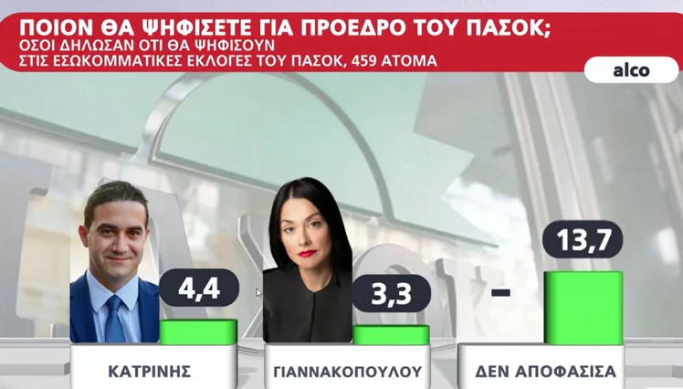 Πολύ υψηλό ποσοστό σημειώνει στην πρόθεση ψήφου το ΠΑΣΟΚ σύμφωνα με τη δημοσκόπηση της Alco σημειώνοντας εισροή πολιτών που ψήφισαν στις προηγούμενες εκλογές ΣΥΡΙΖΑ. Ο ΣΥΡΙΖΑ έρχεται τέταρτος ενώ όπως φαίνεται στην δημοσκόπηση υπάρχει σαφής άνοδος για την Ελληνική Λύση. Αυτό που καταδεικνύεται από τη δημοσκόπηση είναι ότι τα κόμματα δεξιότερα της Νέας Δημοκρατίας παρουσιάζουν μία κάποια δυναμική.