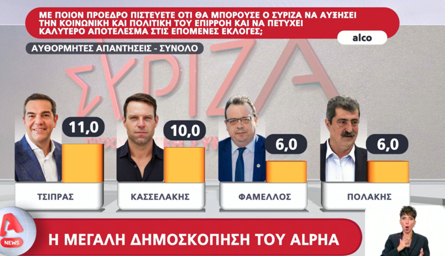 Ο απόλυτος διχασμός παρατηρείται στον ΣΥΡΙΖΑ ενώ μικρό προβάδισμα έναντι των άλλων καταγράφει ο Στέφανος Κασσελάκη, αλλά όχι σε ψηφοφόρους του ΣΥΡΙΖΑ. Όπως σημειώνει ο Κώστας Παναγόπουλος, διευθύνων σύμβουλος της Alco, δεν υπάρχει πρόσωπο που να θεωρεί ότι αν ήταν στην ηγεσία του ΣΥΡΙΖΑ θα πολλαπλασίαζε το κόμμα τη δύναμή του.