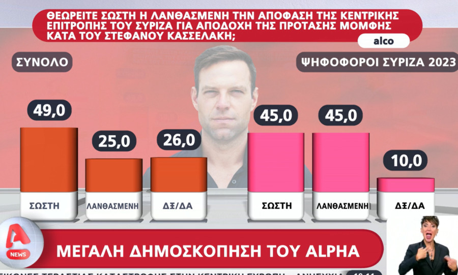 Διαφορετική είναι η εικόνα ανάμεσα στους ψηφοφόρους του ΣΥΡΖΑ όπου έχει σαφές προβάδισμα ο Στέφανος Κασσελάκης, με 1 στους 3 να τον στηρίζουν.