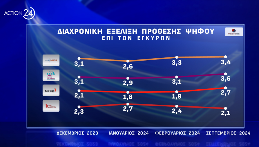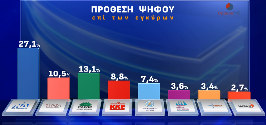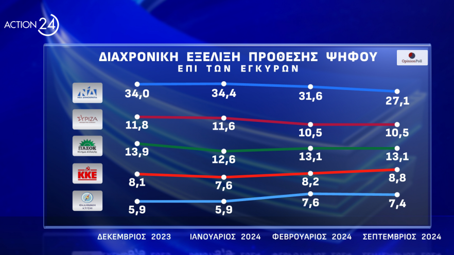 Η Νέα Δημοκρατία προηγείται με 14 ποσοστιαίες μονάδες έναντι του ΠΑΣΟΚ, που βρίσκεται στη δεύτερη θέση, στη δημοσκόπηση της Opinion Poll για το Action 24.