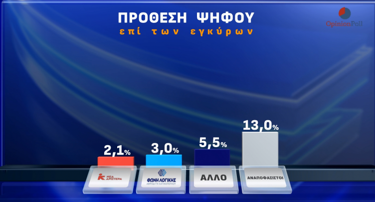 Στην πρόθεση ψήφου με αναγωγή επί των έγκυρων το κυβερνών κόμμα συγκεντρώνει το 27,1%. Το ΠΑΣΟΚ είναι στη δεύτερη θέση (13,1%), έχοντας διαφορά 2,6 ποσοστιαίων μονάδων από τον τρίτο ΣΥΡΙΖΑ (10,5%). Ακολουθούν το ΚΚΕ (8,8%) και η Ελληνική Λύση (7,4%).