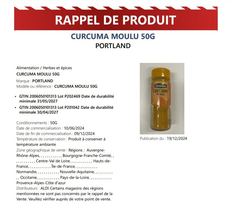 Συναγερμός και ανάκληση από τις ευρωπαϊκές αγορές για επικίνδυνα μπαχαρικά που ενέχουν σημαντικό κίνδυνο για την υγεία των καταναλωτών που θα τα χρησιμοποιήσουν. H πρώτη ανάκληση αφορά κουρκουμά που κυκλοφορεί στην Γαλλία. Πρόκειται για το προιόν CURCUMA MOULU 50G της PORTLAND με GTIN 2006050101313 Lot P202469 Ημερομηνία ανάλωσης 31/05/2027 και GTIN 2006050101313 Παρτίδα P201042 Ελάχιστη ημερομηνία διατηρησιμότητας 30/04/2027. Σύμφωνα με τις γαλλικές Αρχές Ασφάλειας Τροφίμων η ανάκληση αποφασίστηκε λόγω υπερβολικής ποσότητας πέραν των επιτρεπόμενων ορίων του φυτοφαρμάκου Chlorpyrifos. Πρόκειται για ένα νευροτοξικό φυτοφάρμακο με τη δραστική ουσία χλωροπυριφός (chlorpyrifos), το οποίο ενοχοποιείται κυρίως για την γέννηση λιποβαρών νεογνών, προβλήματα διάσπασης προσοχής και μειωμένου IQ στα παιδιά.