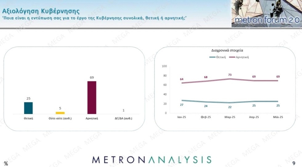 Η αξιολόγηση του κυβερνητικού έργου από τους πολίτες είναι πολύ αρνητική. Το 69% κρίνει αρνητικά το έργο της κυβέρνησης, με μόνο το 25% να έχει θετικές κρίσεις. Είναι αξιοσημείωτο ότι οι αρνητικές κρίσεις παραμένουν σταθερές, παρά την άνοδο της ΝΔ στην πρόθεση ψήφου. Έχει επίσης ενδιαφέρον ότι οι θετικές κρίσεις για την κυβέρνηση είναι μόλις κατά 2,4% μεγαλύτερες από ποσοστό της ΝΔ στην πρόθεση ψήφου.