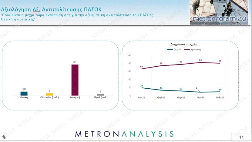 Ο συνδυασμός της ανόδου της ΝΔ στην πρόθεση ψήφου με τη συντριπτικά αρνητική αξιολόγηση του κυβερνητικού έργου, θα μπορούσε να θεωρηθεί αντιφατικός. Στην πραγματικότητα δεν είναι. Η αξιολόγηση του ΠΑΣΟΚ ως αξιωματική αντιπολίτευση είναι ακόμα πιο αρνητική, αφού ένα εντυπωσιακό 81% εκφέρει αρνητική κρίση, με μόλις 10% να εκφράζει την ικανοποίησή του. Οι πολίτες απορρίπτουν την αξιωματική αντιπολίτευση περισσότερο από ό,τι την κυβέρνηση.