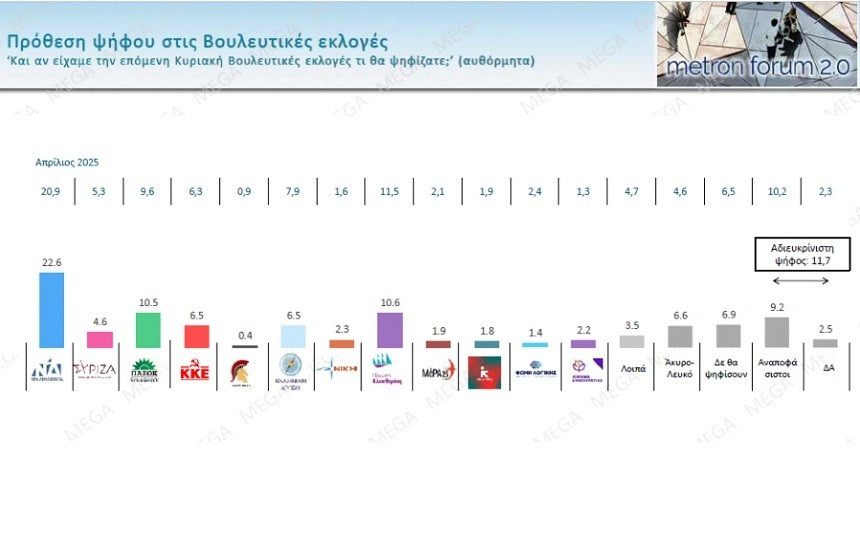 Η εικόνα που προκύπτει από τη δημοσκόπηση της Metron θα μπορούσε να θεωρηθεί «μαγική», αλλά έχει λογική εξήγηση. Στην πρόθεση ψήφου η ΝΔ παίρνει 22,6%, ανεβαίνοντας 1,7% από την προηγούμενη έρευνα της εταιρίας. Ακολουθεί η Πλεύση Ελευθερίας με 10,6% (από 11,5%). Στη συνέχεια έρχονται το ΠΑΣΟΚ με 10,5% (από 9,6%), το ΚΚΕ με 6,5% (από 6,3%), η Ελληνική Λύση και αυτή με 6,5% (από 7,9%), ο ΣΥΡΙΖΑ με 4,6% (από 5,3%). Νίκη, Φωνή Λογικής, Κίνημα Δημοκρατίας, ΜέΡΑ25 και Νέα Αριστερά είναι κάτω από το 3%.