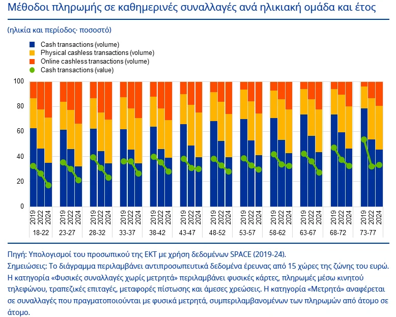 τα νεότερα άτομα (18-22 και 23-27 ετών) αναφέρουν σταθερά υψηλότερα επίπεδα προληπτικής διακράτησης μετρητών, αφετέρου καταγράφεται σαφής αύξηση στην αντιληπτή σημασία των μετρητών ως επιλογή πληρωμής από το 2019-24 σε όλες τις ηλικιακές ομάδες.