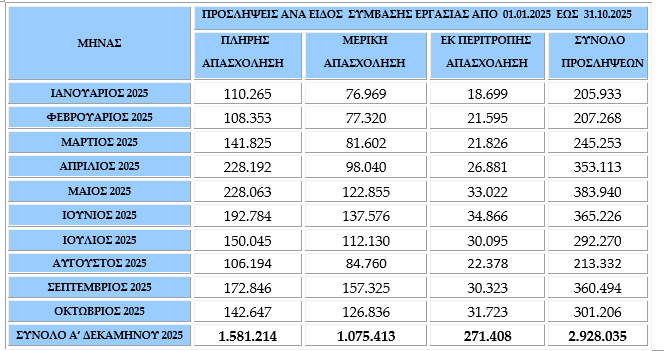 Αθροιστικά για την περίοδο Ιανουάριος – Οκτώβριος 2025, οι αναγγελίες προσλήψεων ανήλθαν στις 2.928.035 θέσεις εργασίας και οι αποχωρήσεις έφτασαν τις 2.739.949, εκ των οποίων οι 1.731.128 ήταν αποτέλεσμα καταγγελιών συμβάσεων αορίστου χρόνου ή λήξεων συμβάσεων ορισμένου χρόνου και οι 1.008.821 οικειοθελείς αποχωρήσεις.