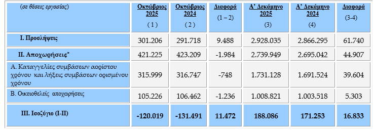Ωστόσο, το ισοζύγιο των ροών μισθωτής απασχόλησης του δεκάμηνου του 2025 είναι θετικό και διαμορφώνεται στις 188.086 νέες θέσεις εργασίας.