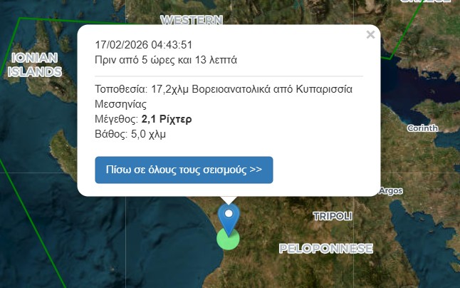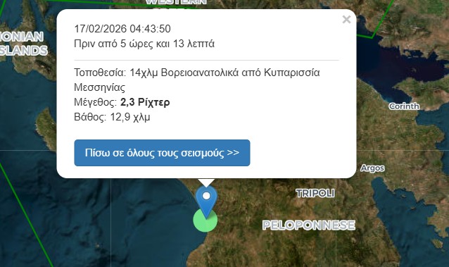 Εντωμεταξύ, λίγο πριν τις 5 τα ξημερώματα, η σεισμική δραστηριότητα συνεχίστηκε στην ευρύτερη περιοχή της Κυπαρισσίας. Συγκεκριμένα, στις 04:43 καταγράφηκαν δύο διαδοχικές σεισμικές δονήσεις μεγέθους 2,3 και 2,1 Ρίχτερ αντίστοιχα. Οι δύο μικρότεροι σεισμοί είχαν επίκεντρο 14 και 17,2 χιλιόμετρα βορειοανατολικά της Κυπαρισσίας.
