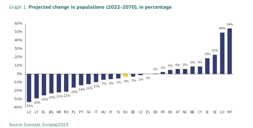 Σύμφωνα με τις μακροπρόθεσμες δημογραφικές προβολές της Eurostat, στην Γηραιά Ήπειρο τις επόμενες δεκαετίες η διάμεση ηλικία του πληθυσμού της θα αυξηθεί κατά 5 έτη (από 44,4 έτη το 2022 σε 49,4 έτη το 2070). Θα σημειωθεί δηλαδή μια έντονη ανοδική μετατόπιση στην ηλικιακή κατανομή του πληθυσμού της που θα χαρακτηρίζεται από τις εξής εξελίξεις:το ποσοστό των ηλικιακών ομάδων άνω των 65 ετών στο σύνολο του πληθυσμού προβλέπεται να αυξηθεί από 21% το 2022 σε 30% το 2070 για την ΕΕ