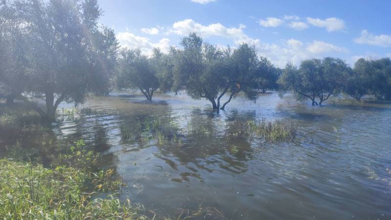 Χωράφια, αγροτικοί δρόμοι και ελαιώνες βρίσκονται κάτω από το νερό, δημιουργώντας μια προσωρινή «λίμνη» που εκτείνεται σε εκατοντάδες στρέμματα.